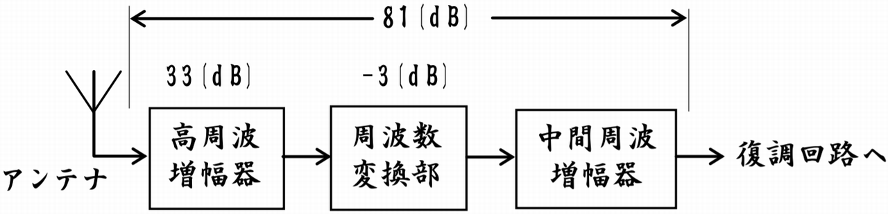 図は、スーパヘテロダイン受信機の構成の一部を示したものである。高周波増幅器の電圧利得が 33〔dB〕、周波数変換部の電圧利得が -3〔dB〕及び高周波増幅器から中間周波増幅器までの全電圧利得が 81〔dB〕のとき、中間周波増幅器の電圧利得の値として、正しいものを下の番号から選べ。